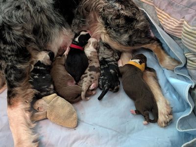 The pups were born and raised in our Portland, OR home . Their mama Lulu is such a good mother. Making sure her pups are always fed and looked after. The pups are growing up in a house that has children and a cat.